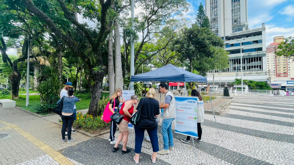 Nesta quinta-feira, 16, a Comusa — Serviços de Água e Esgoto e a empresa Socialis Consultoria, Pesquisa e Assessoria realizaram um plantão social na Praça do Imigrante, no Centro de Novo Hamburgo. A iniciativa teve como objetivo distribuir folders informativos e tirar as dúvidas da comunidade em relação às obras da ETE Luiz Rau.